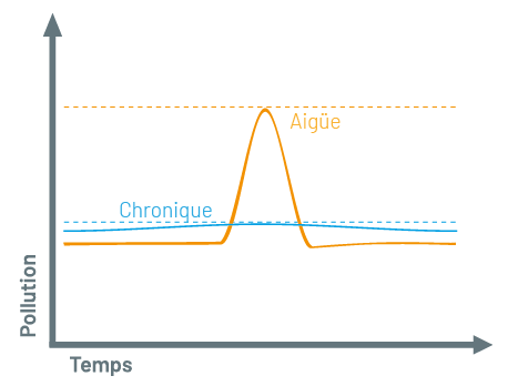 Représentée en bleue sur le graphique ci-contre, l'exposition chronique se caracrérise par une exposition de longue durée à des niveaux de pollution atmosphérique ambiants. Elle correspond à la qualité de l'air respiré au quotidien.